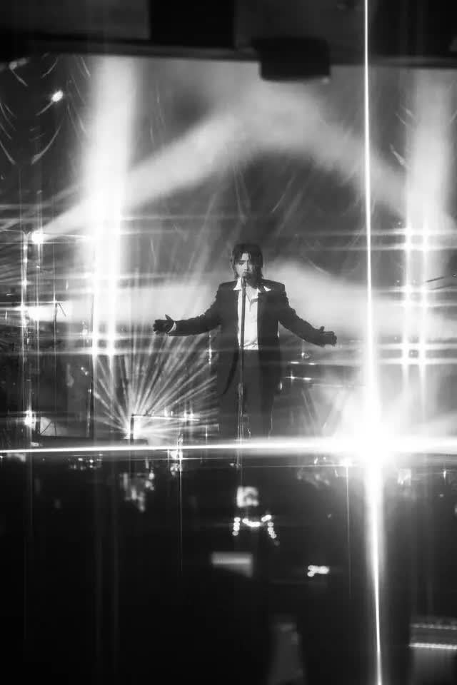 这套来自 2005 年的 CDG HOMME 古着西装,是川久保玲男装线的经典之作,自带跨越时间的先锋质感与复古底蕴。利落的廓形彻底摒弃了传统正装的刻板厚重,保留了品牌标志性的解构剪裁,宽松垂坠的版型在舞台上随着他的动作舒展流动,既有复古绅士的优雅腔调,又藏着不被规则束缚的反叛与自由,与 “牛仔之夜” 的不羁主题形成了绝妙的风格共振。挺括的肩线勾勒出他挺拔优越的身形,内搭一件简约白衬衫,解开的领口随性慵懒,褪去了舞台造型的华丽繁复,反而让所有焦点都汇聚于他本人的舞台表现力,越简约,越见锋芒。